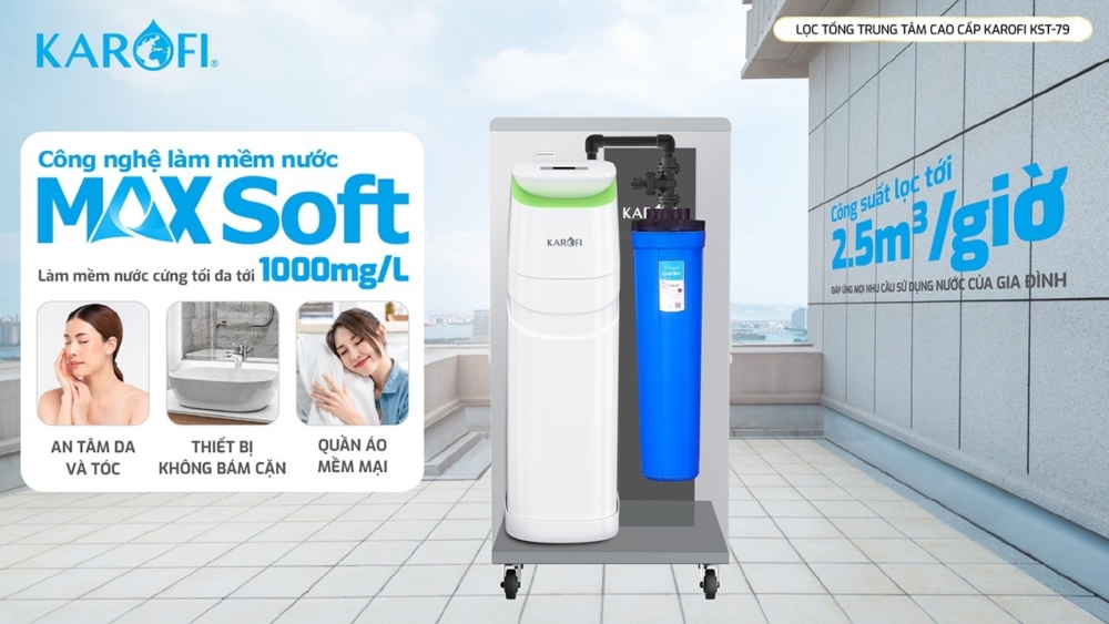 Karofi KST-79 có khả năng xử lý nước đầu nguồn với công suất lên tới 2.5 m³/giờ, kết hợp khả năng làm mềm nước tối đa 1000 mg/L, đảm bảo đáp ứng đầy đủ nhu cầu sử dụng nước sinh hoạt cho cả gia đình.