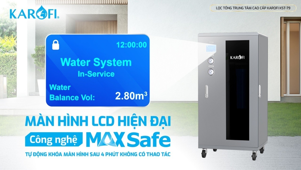 Hệ thống lọc tổng trung tâm cao cấp Karofi KST-79 được trang bị màn hình LCD thông minh, hiển thị rõ ràng các thông số như lượng nước thành phẩm, lưu lượng nước đang hoạt động, thời điểm sục rửa – hoàn nguyên trong ngày cùng 7 chế độ vận hành, bao gồm 6 chế độ sục rửa tự động. Công nghệ MAX SAFE hiện đại giúp màn hình tự động tắt sau 4 phút không có thao tác, vừa bảo vệ thiết bị, vừa tránh tối đa các thao tác chạm nhầm khi sử dụng.