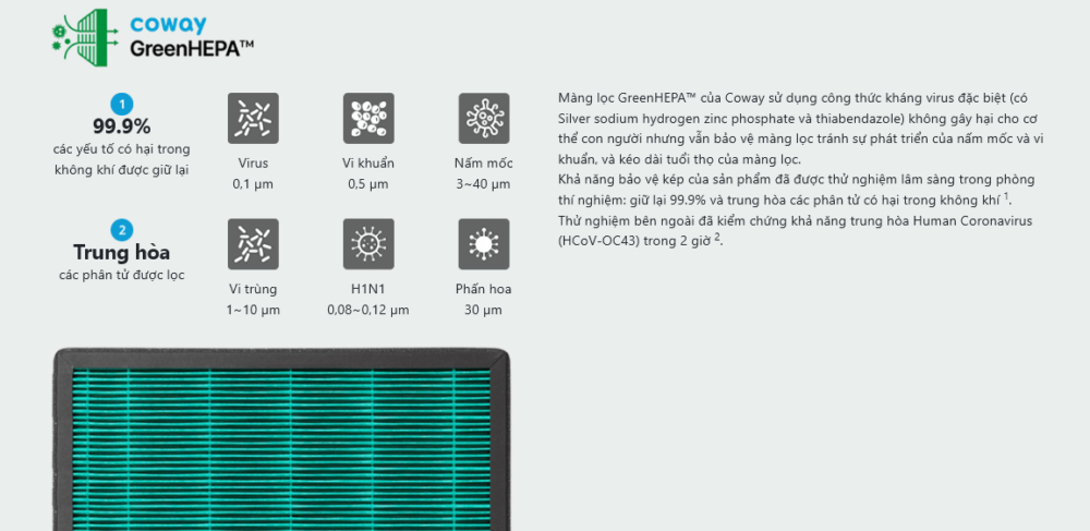 Cả hai thử nghiệm đều được thực hiện trên các mẫu thử nhỏ được cắt ra từ màng lọc GreenHEPA™, do đó, kết quả thử nghiệm này có thể được sử dụng cho bất kỳ sản phẩm Coway nào sử dụng bộ lọc này.– Virus: Đã kiểm tra virus Cúm A (H1N1), miếng hấp tiệt trùng kích thước 3cm x 3 cm