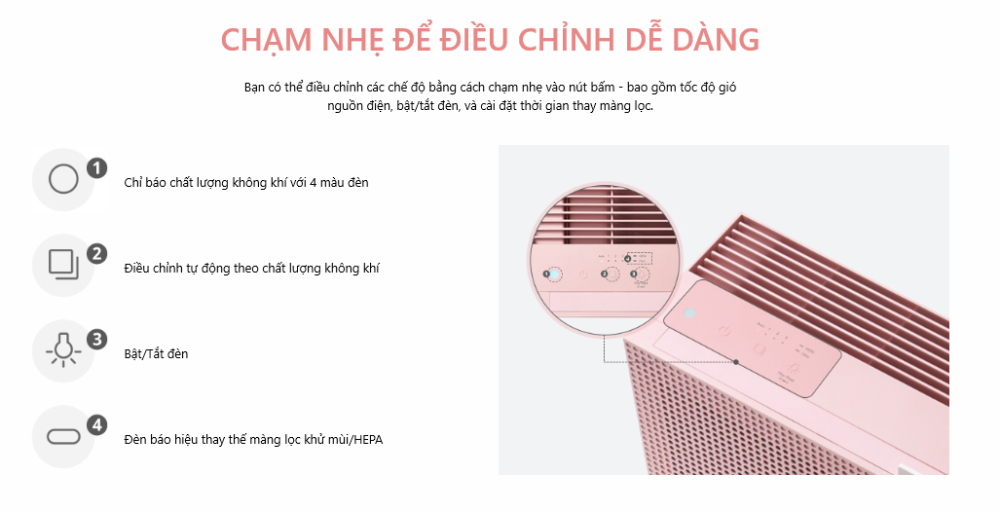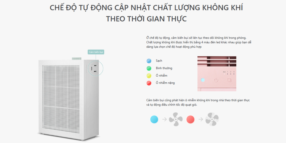 Cảm biến thông minh & vận hành tự động: Cảm biến bụi giúp máy tự động điều chỉnh tốc độ gió theo mức độ ô nhiễm; đèn chỉ báo chất lượng không khí giúp người dùng dễ theo dõi.