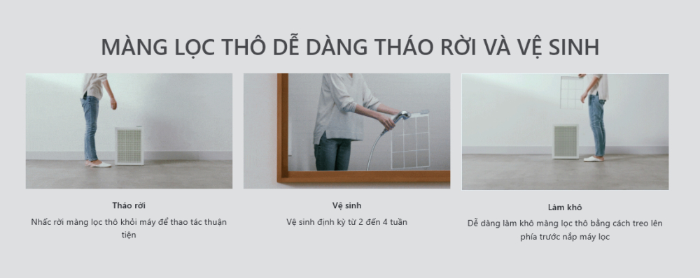 Thay màng lọc dễ dàng linh hoạt: Màng lọc thô có thể tháo rời để vệ sinh, màng HEPA / than hoạt tính thay định kỳ giúp tiết kiệm chi phí và giữ hiệu năng lọc cao lâu dài.