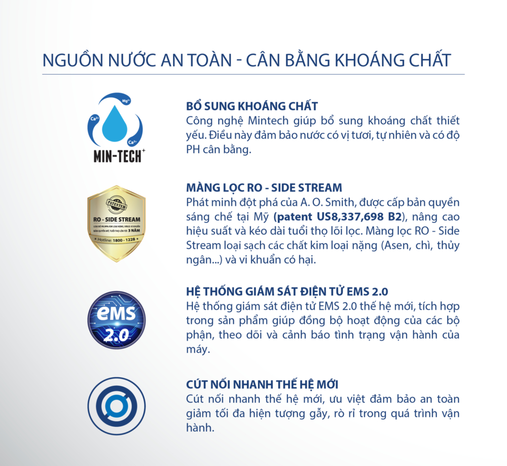 Máy lọc AO Smith E3 sử dụng hệ thống 5 cấp lọc, bắt đầu từ lọc thô, than hoạt tính đến màng RO – Side Stream. Nước sinh hoạt được xử lý lần lượt qua các lõi lọc, sau đó được lưu trữ trong bình chứa ~6 L. Hệ thống EMS 2.0 đảm bảo quá trình lọc luôn ổn định bằng cách tự động sục rửa lõi khi cần thiết và cảnh báo đến người dùng thông tin quan trọng như thay lõi hay lỗi vận hành.
