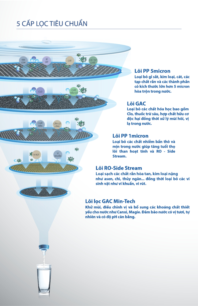 Với công nghệ Min-Tech, nước sau lọc vẫn giữ kèm khoáng cần thiết và vị tự nhiên, phù hợp cho uống trực tiếp hàng ngày.