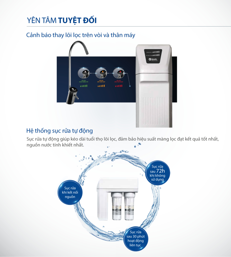 Vòi điện tử và màn hình LED cho phép bạn nắm bắt rõ thời điểm cần thay lõi, giúp duy trì hiệu suất lọc nước an toàn.
