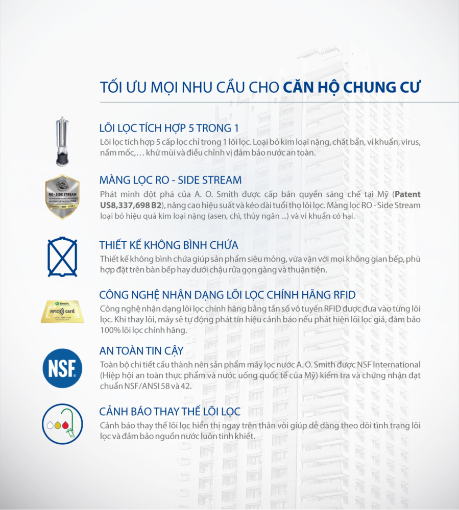 Máy lọc nước AO Smith R400E là giải pháp lọc nước tinh khiết đặt gầm tối ưu cho gia đình hiện đại — đặc biệt với không gian bếp nhỏ hẹp. Sản phẩm sử dụng công nghệ RO-Side Stream bản quyền Mỹ, kết hợp hệ thống 7 cấp lọc và vòi nước điện tử hiện đại, cung cấp nước uống trực tiếp sạch, an toàn và tiết kiệm nước thải.